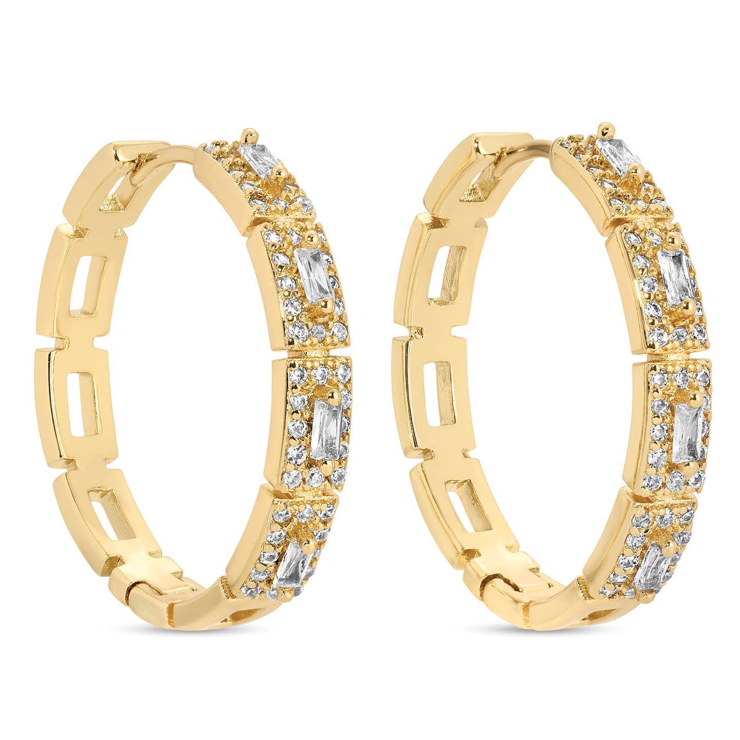 Amp up your earring game with these fabulously chic large huggies, featuring a baguette cubic zirconia adorned with pave accents for an extra touch of pizzazz. Undeniably sophisticated and effortlessly elegant, these earrings are sure to make a statement.