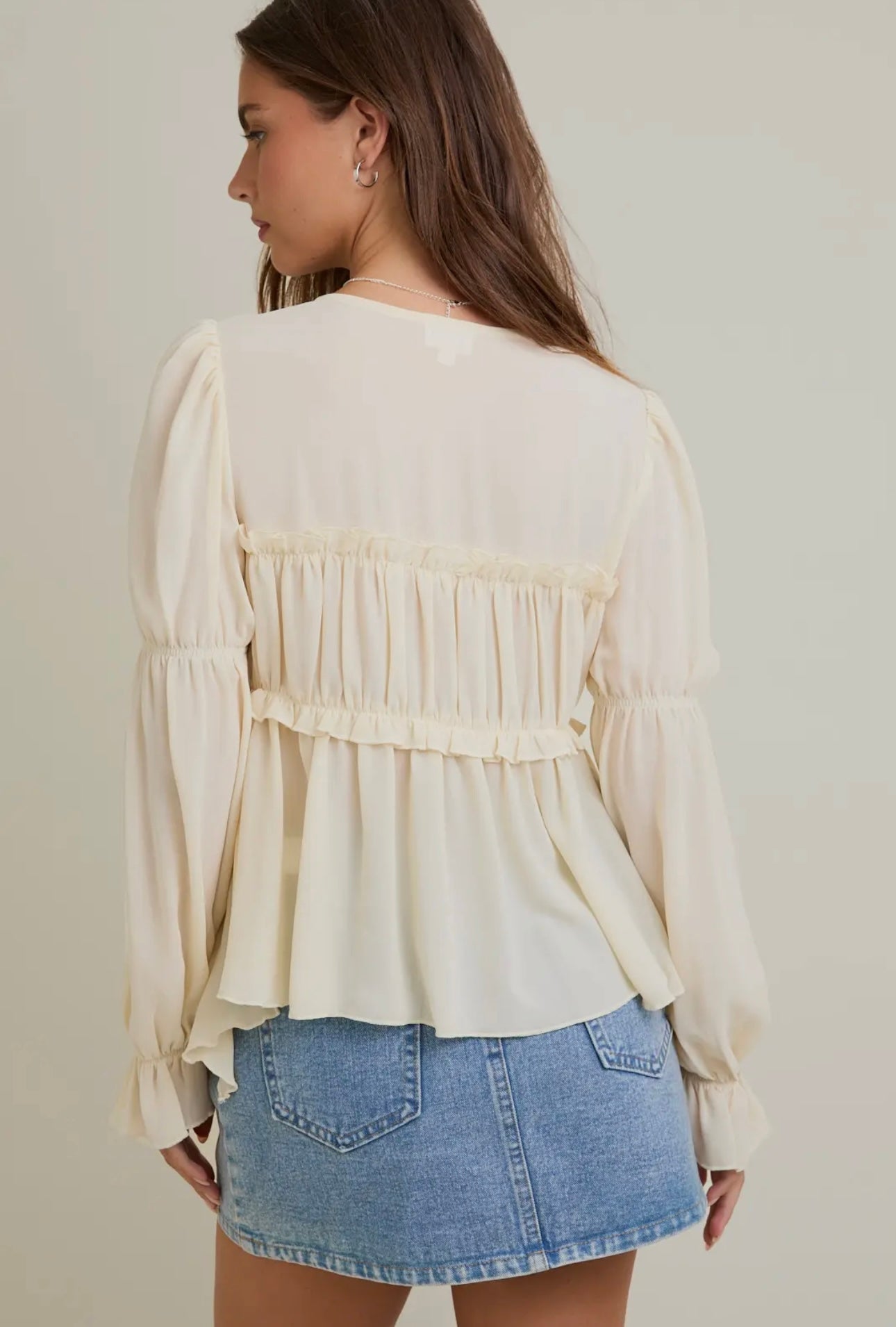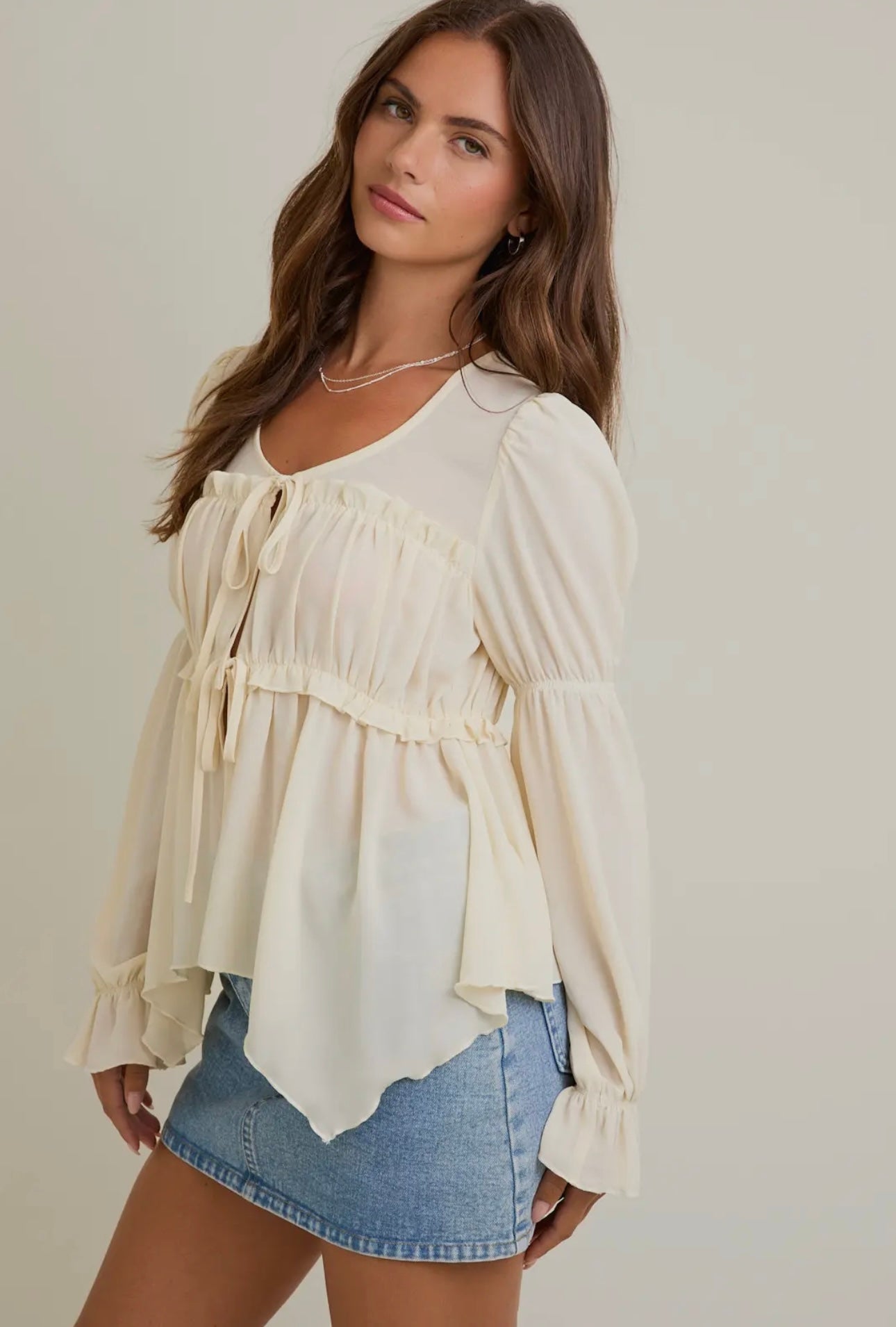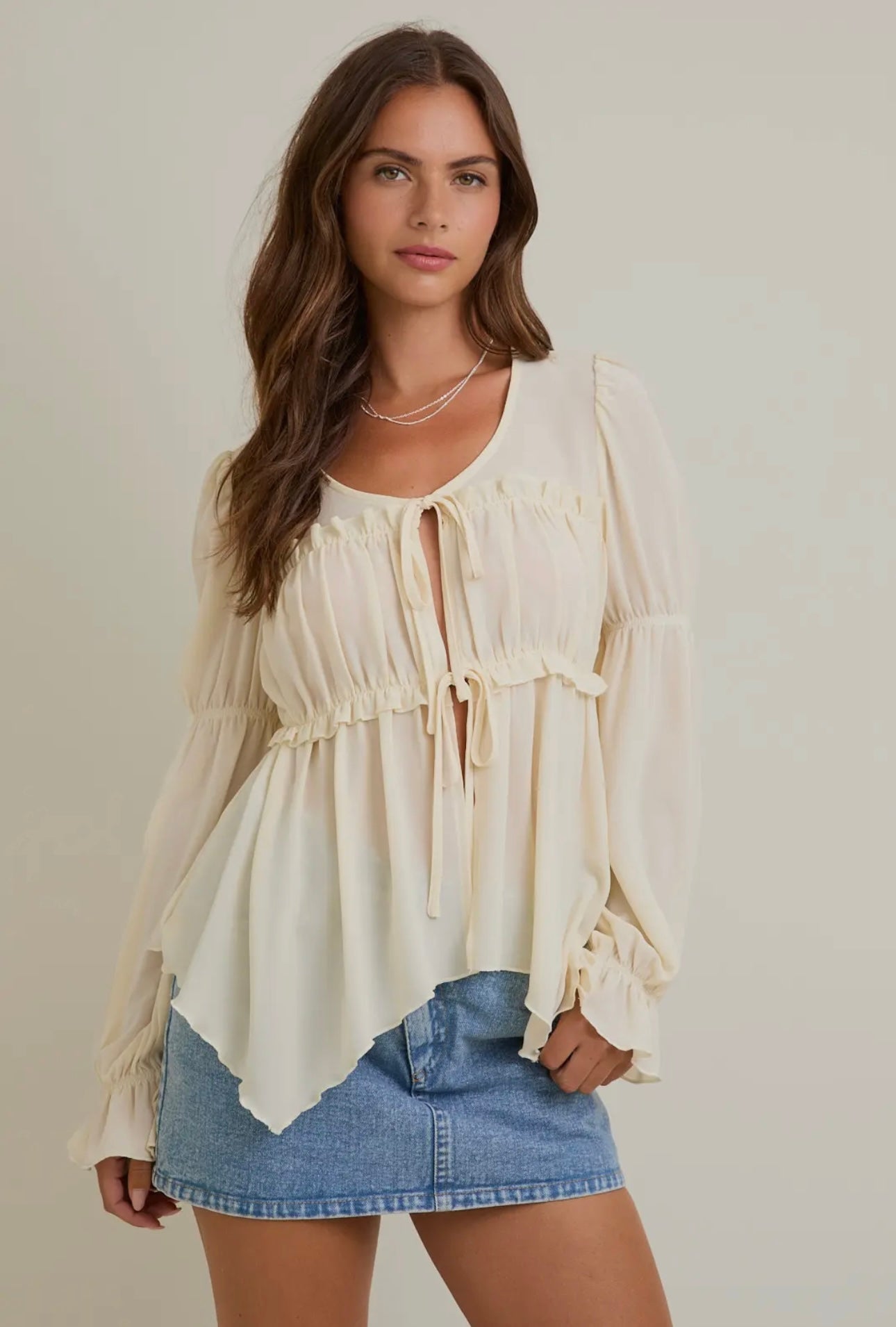 Light, airy, and effortlessly elegant — this cream tie-front chiffon blouse is a timeless staple with a modern twist. Crafted from slightly sheer chiffon, it features long sleeves, a delicate drape, and a flattering front tie detail that adds a soft, feminine touch. Perfect for layering or wearing on its own, this blouse pairs beautifully with everything from tailored trousers to denim for an elevated everyday look.