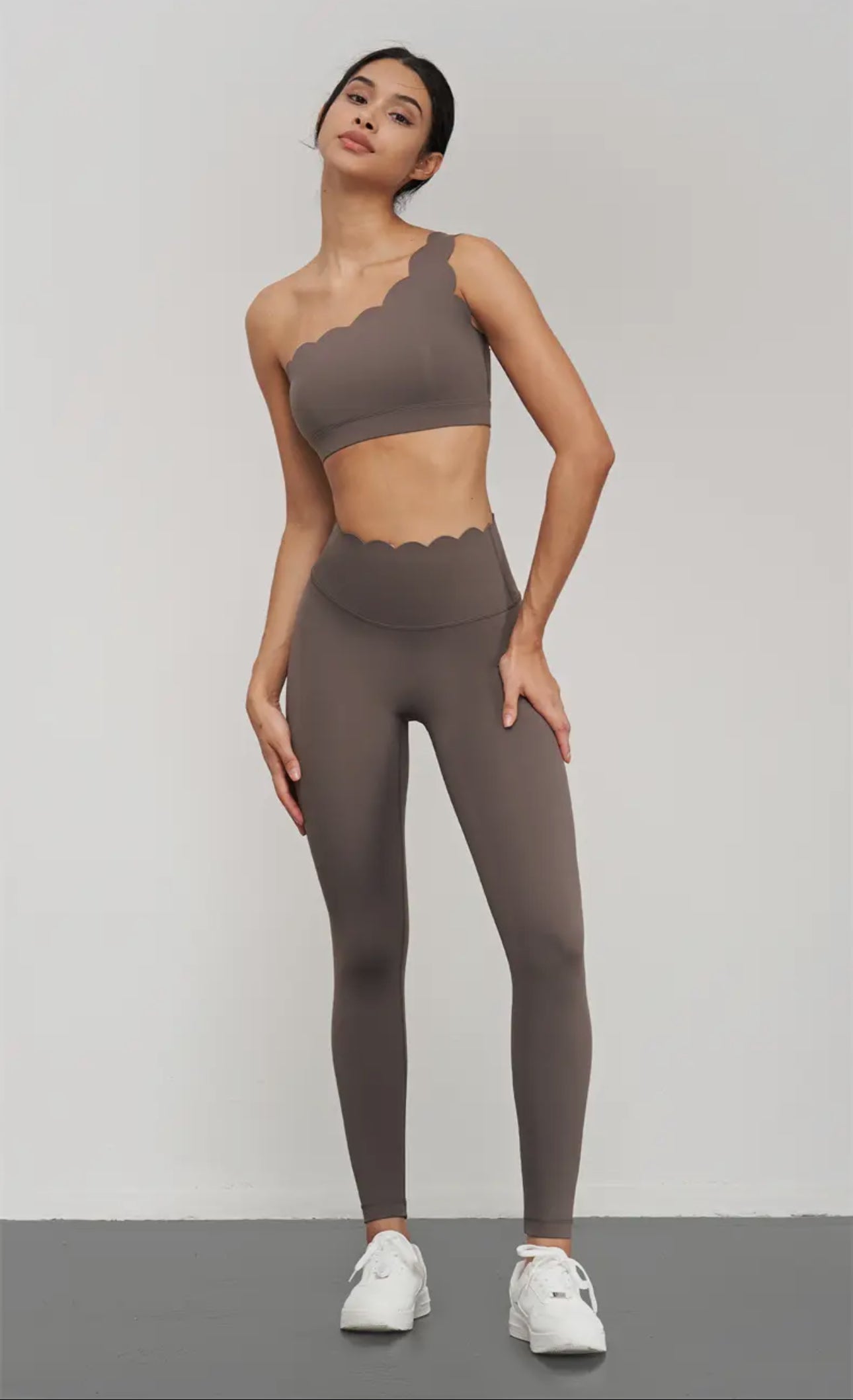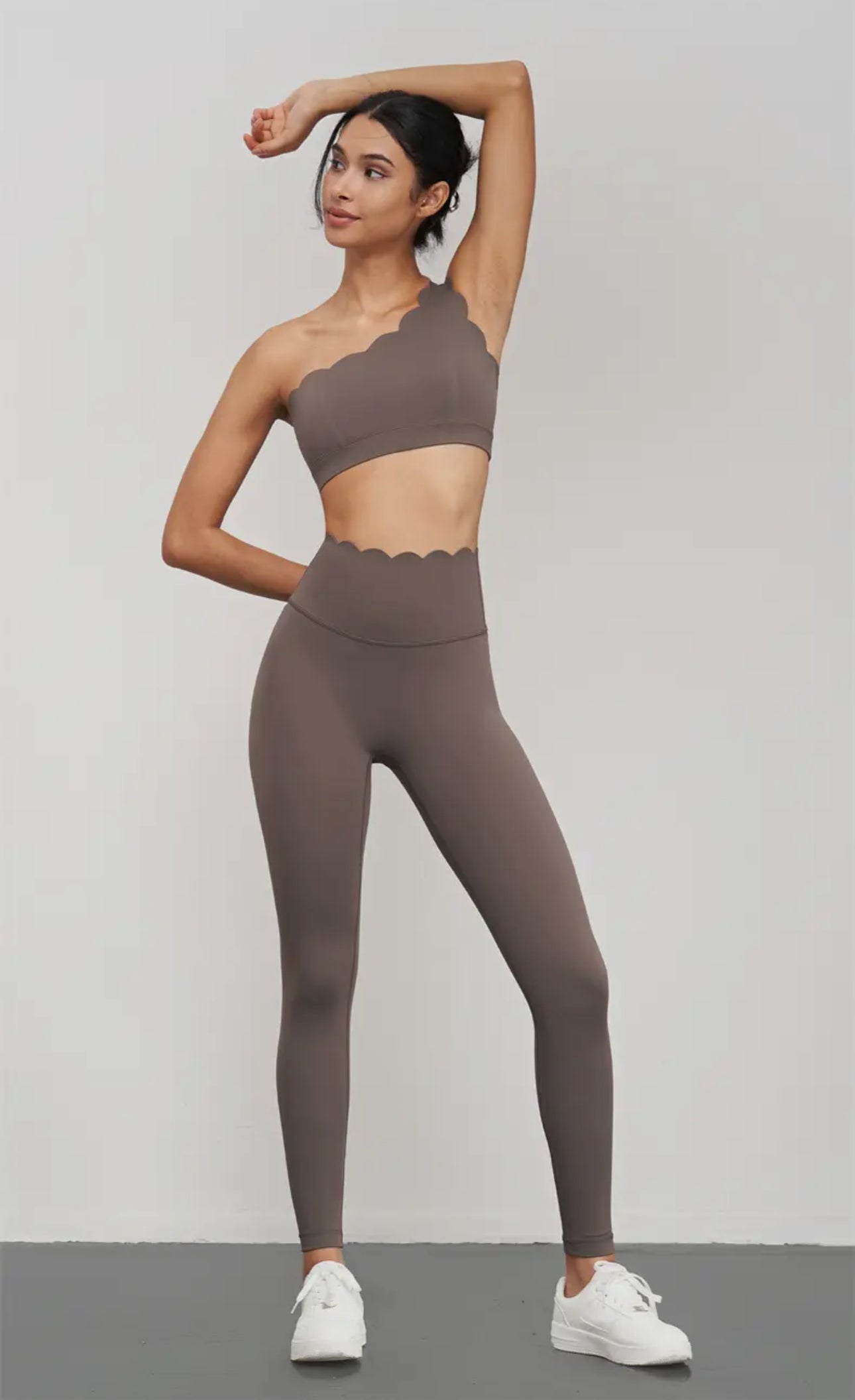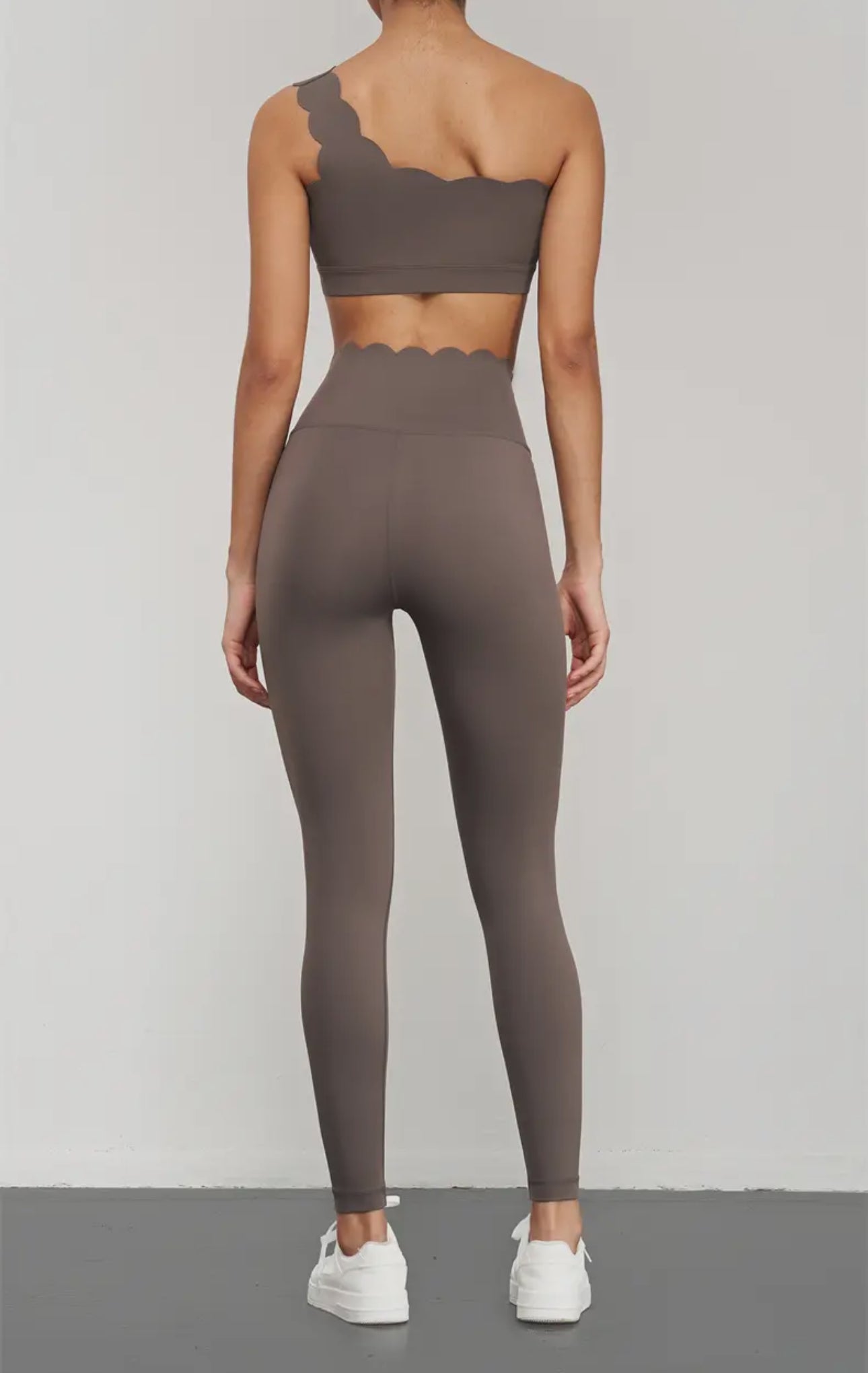 Embrace elegance and performance with the Scallop One Shoulder Sports Bra and Leggings Set. This stunning activewear set features a unique scallop edge design that adds a touch of femininity to your workout wardrobe. The one-shoulder sports bra offers stylish support and comfort, while the high-waisted leggings provide a flattering fit and secure hold. Made from high-quality, moisture-wicking fabric, this set ensures you stay cool and dry during your most intense workouts. Perfect for yoga, Pilates, or any fitness routine, the Helena set combines fashion and function to help you move confidently and comfortably.