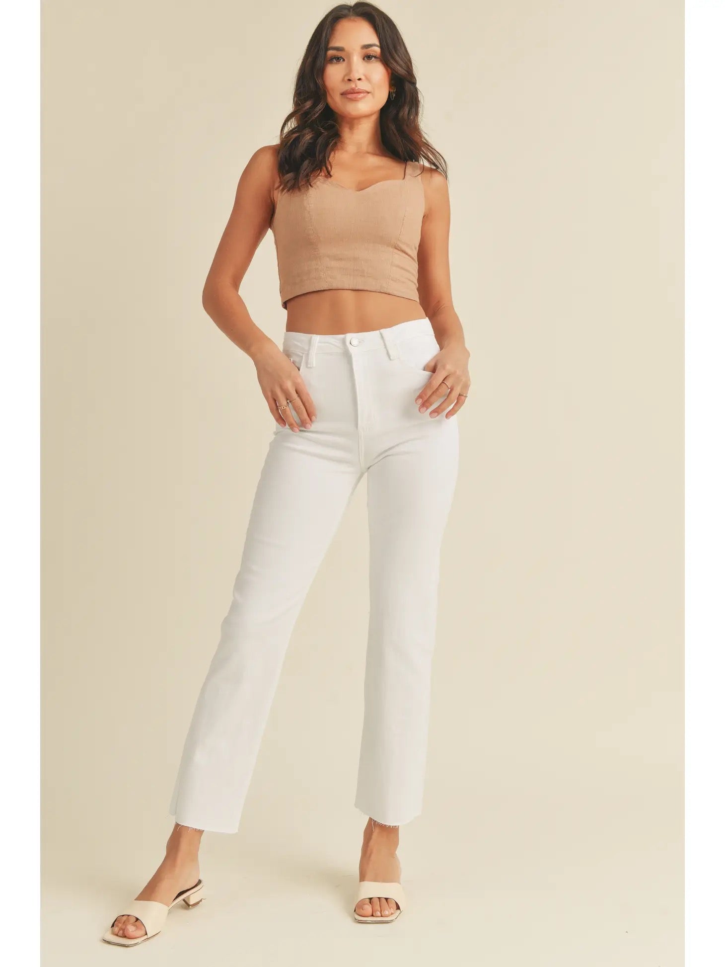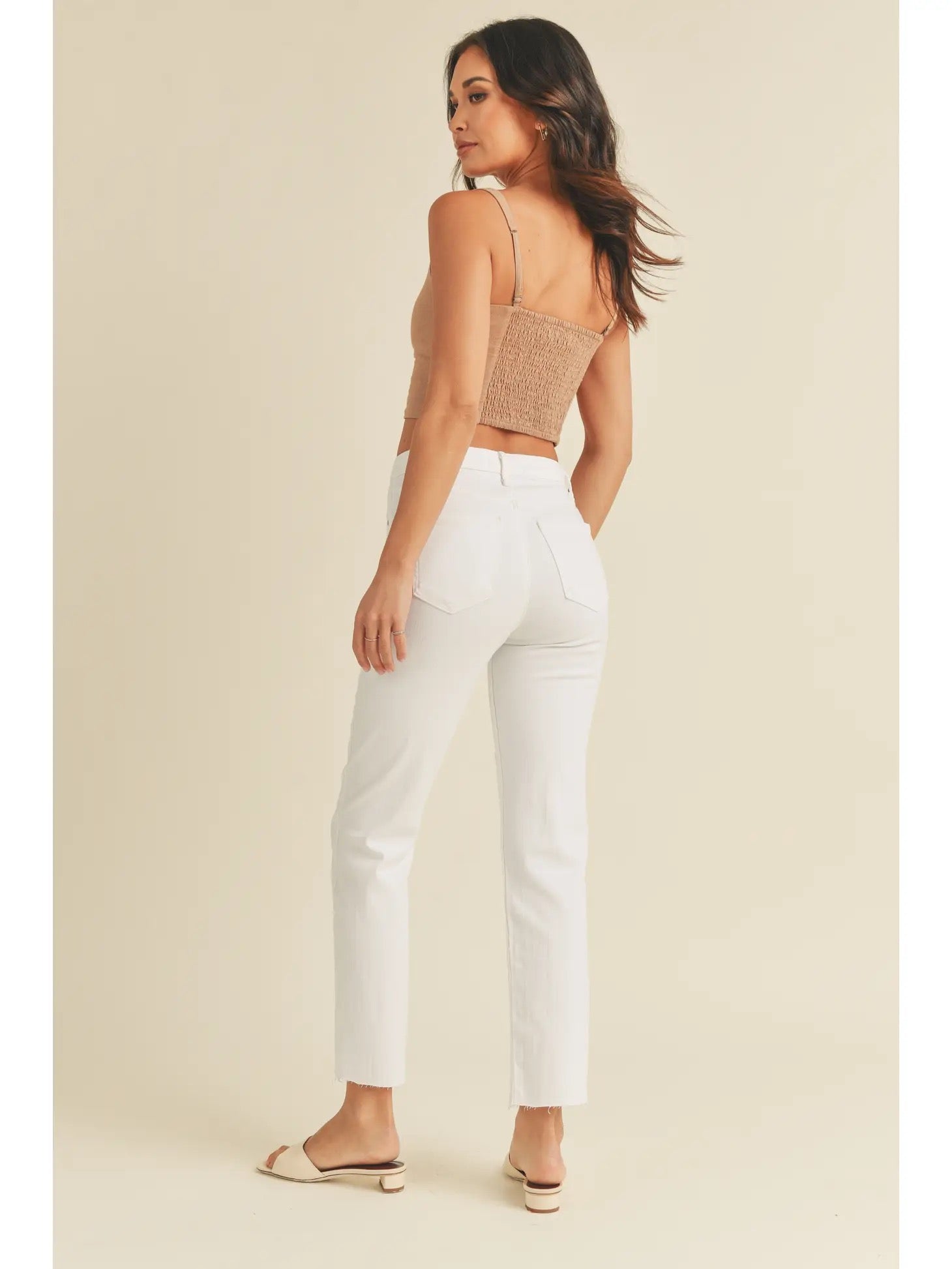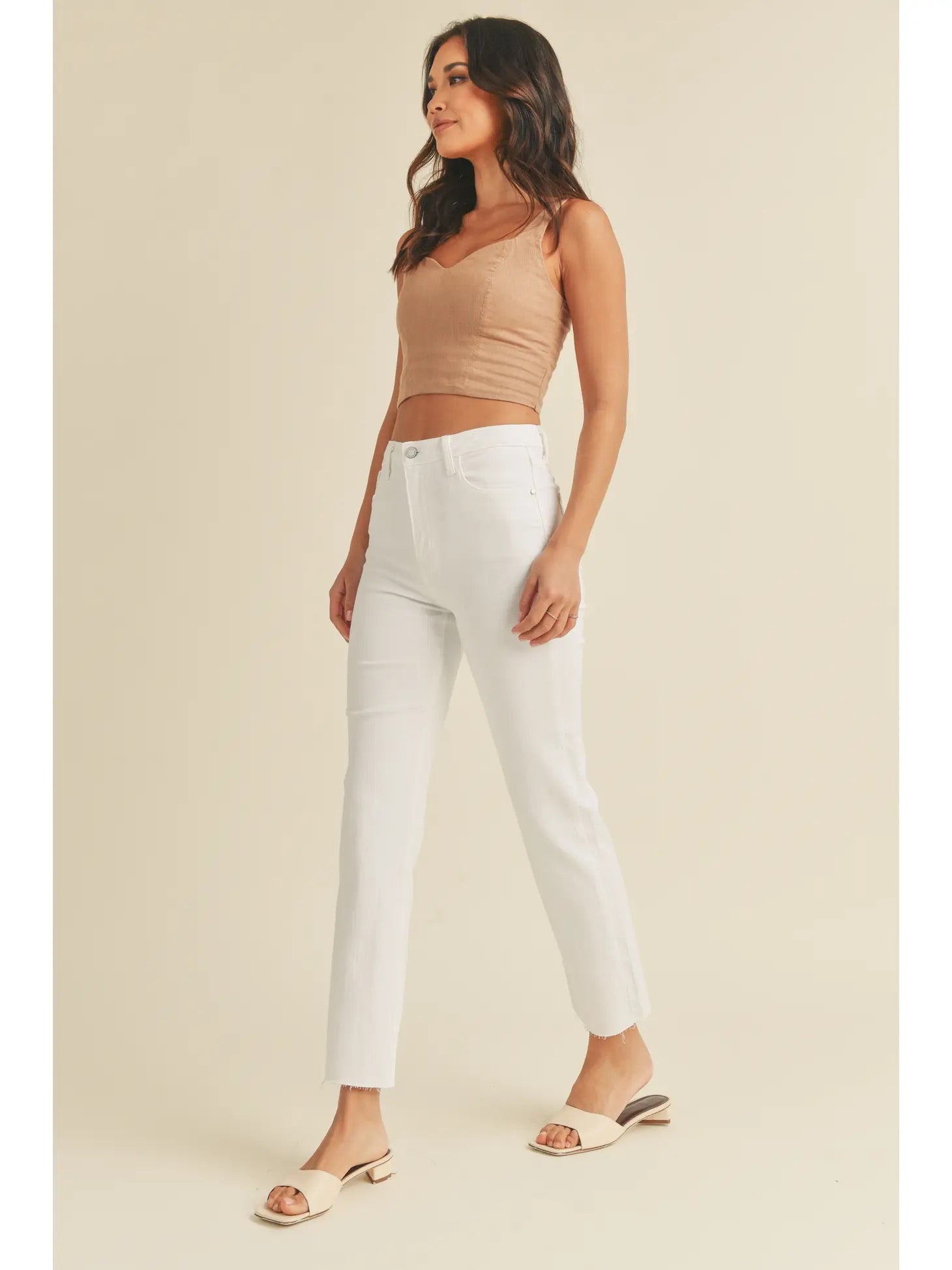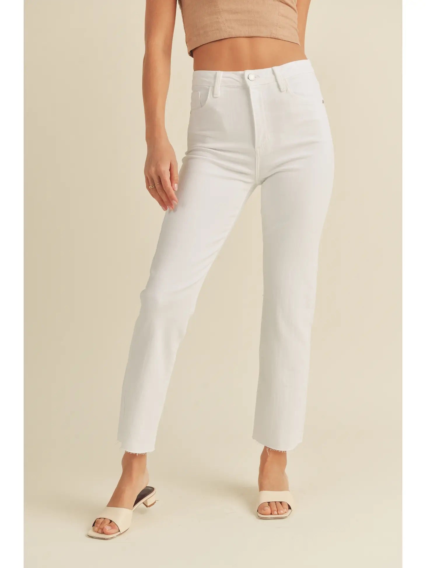 White denim is an essential summer staple and is a versatile wardrobe piece. This pair are especially great because they are completely opaque, they have just the right amount of stretch and the straight leg lends itself well to pairing with a variety of different shoe wear options from sneakers, to flat sandals to dress sandals. Additionally, the high rise waist works perfectly with the semi cropped tops that are popular this season and also looks great with bodysuits and tucked in tops.
