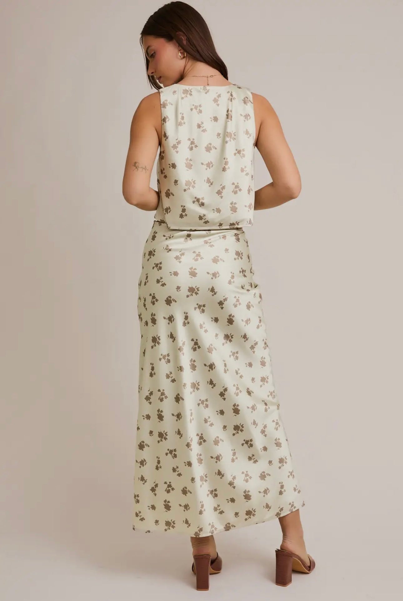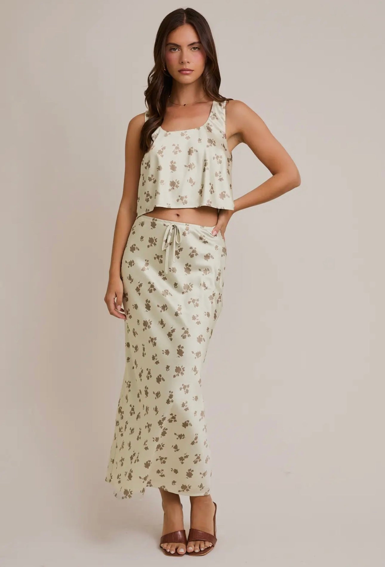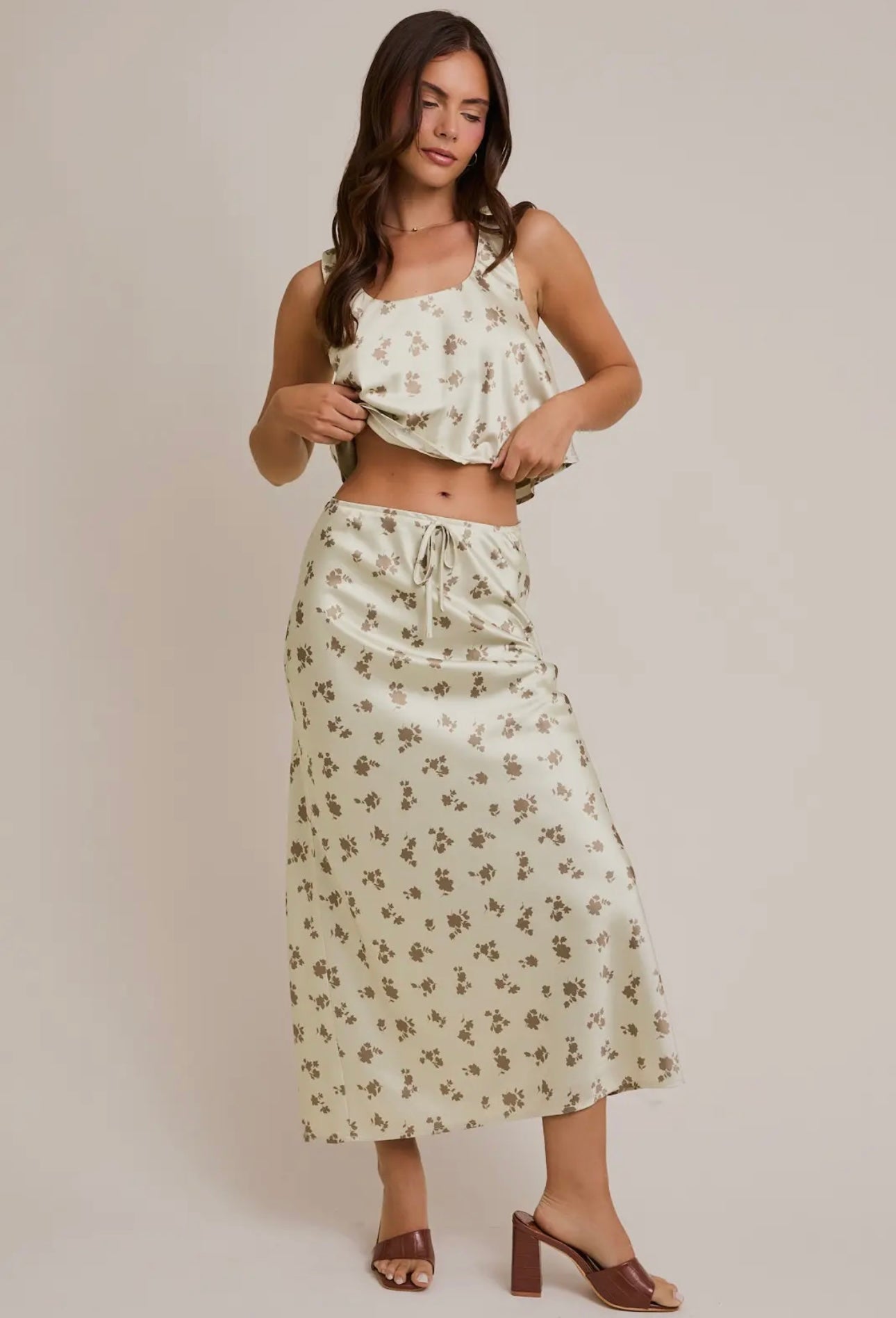 Turn heads in this stunning satin co-ord set, featuring a cropped square-neck top and a matching midi skirt in a soft sage floral designer print. The smooth satin fabric drapes beautifully, offering a subtle sheen that elevates the entire look. The structured yet feminine silhouette balances modern edge with timeless charm—perfect for garden parties, weddings, or any occasion where you want to feel effortlessly chic.